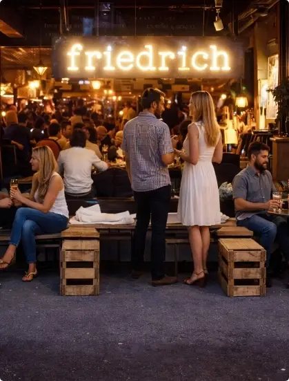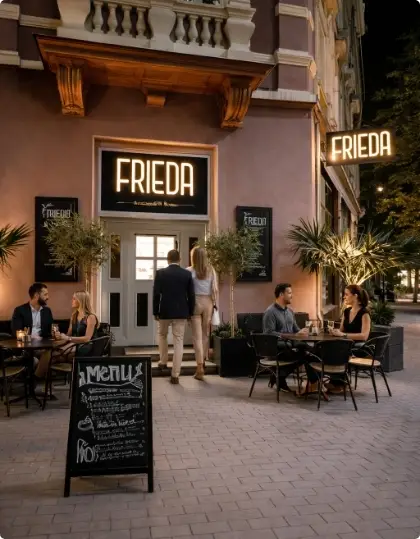 FRiEDA und friedrich sind mehr als Restaurant und Bar – sie sind Orte für gemeinsame Freude am Essen, an guten Drinks und an besonderen Momenten. Unser Konzept lebt vom Teilen: von Speisen, von Zeit und von Erlebnissen, die verbinden. Ob gemütliches Dinner in der FRiEDA oder ausgelassener Abend im friedrich – beide Locations kannst du exklusiv für dein Event mieten. Cheers auf gute Zeiten und auf euch!